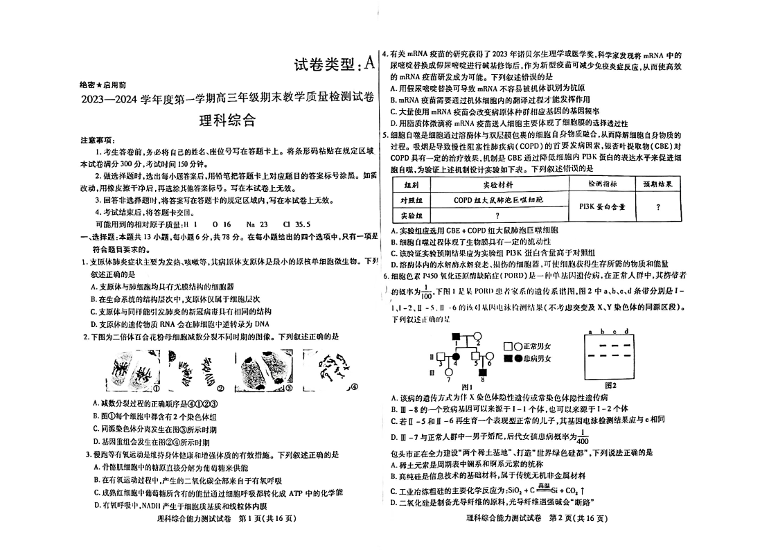 内蒙古包头市2023-2024学年高三上学期期末考试理科综合
