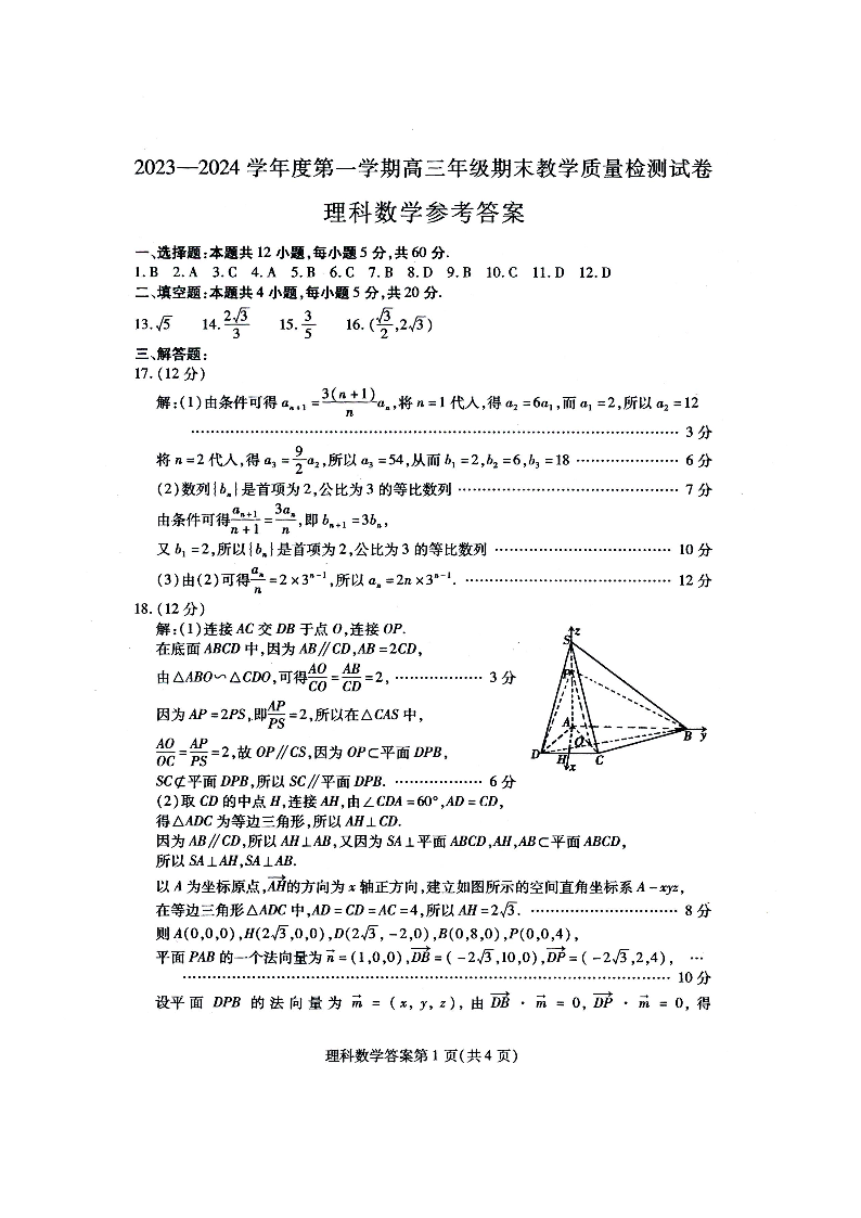 内蒙古锡林郭勒盟2023~2024学年第一学期高三年级全盟统考理数答案
