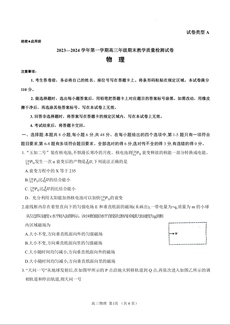 内蒙古锡林郭勒盟2023-2024学年第一学期高三全盟统考物理