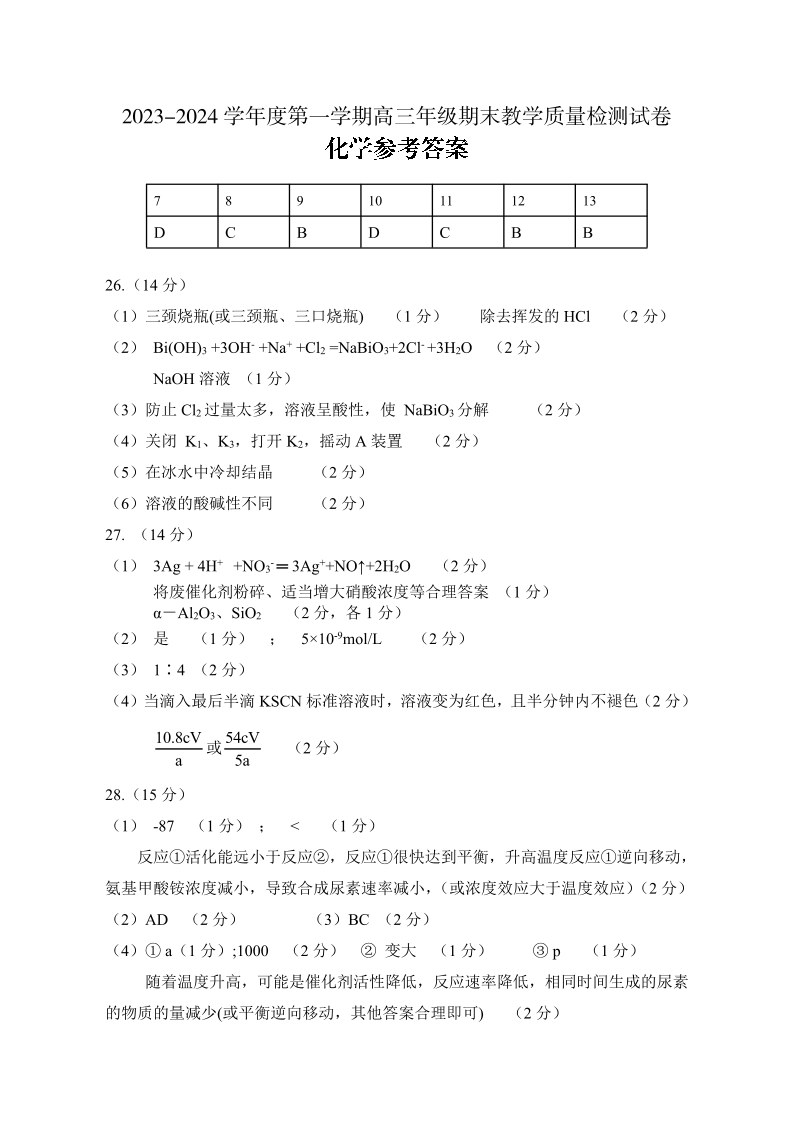 内蒙古锡林郭勒盟2023~2024学年第一学期高三年级全盟统考化学答案