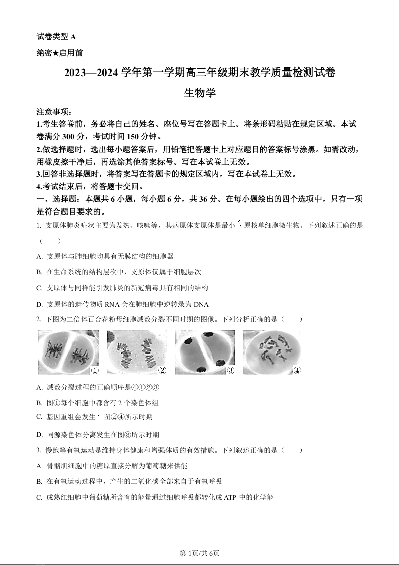 内蒙古自治区锡林郭勒盟2023-2024学年高三1月期末生物(原卷版)