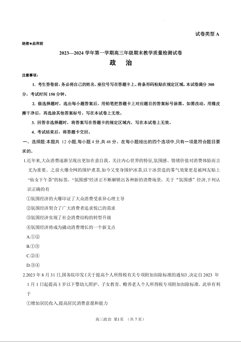 内蒙古锡林郭勒盟2023~2024学年第一学期高三年级全盟统考政治