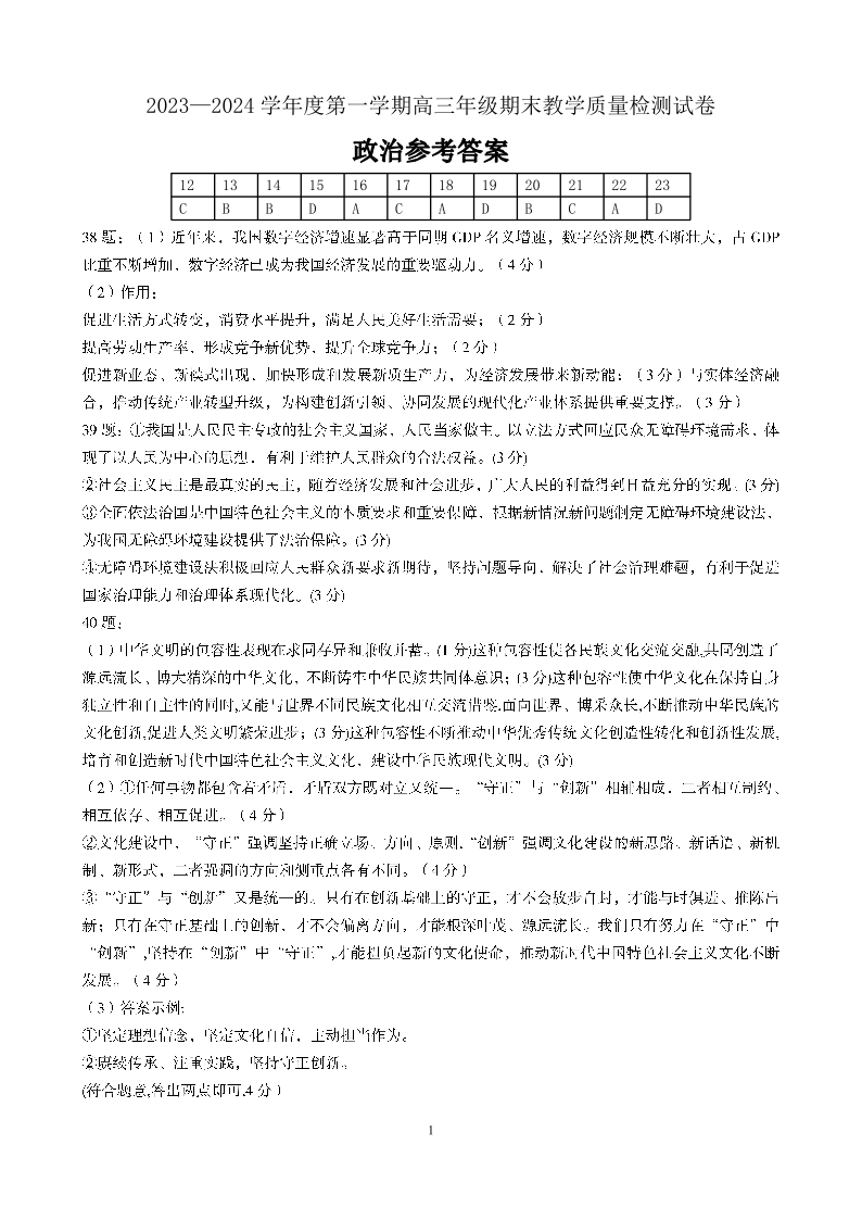 内蒙古锡林郭勒盟2023~2024学年第一学期高三年级全盟统考政治答案