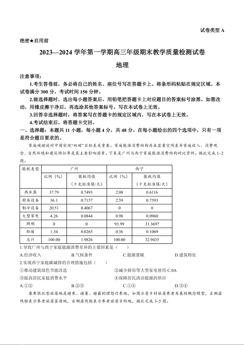 内蒙古自治区锡林郭勒盟2023-2024学年高三上学期期末地理试题+答案