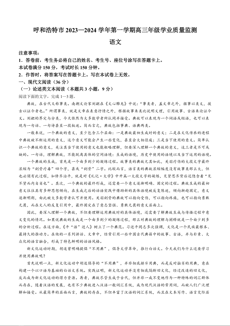 内蒙古自治区呼和浩特市2024届高三上学期期末教学质量检测语文+答案