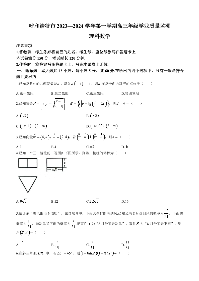 内蒙古自治区呼和浩特市2024届高三上学期期末教学质量检测理科数学+答案