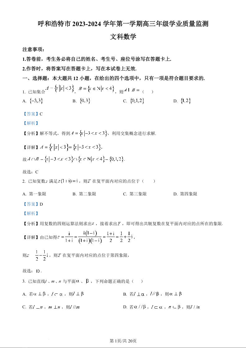 内蒙古呼和浩特市2024届高三上学期学业质量监测数学(文)试题(精品解析版)