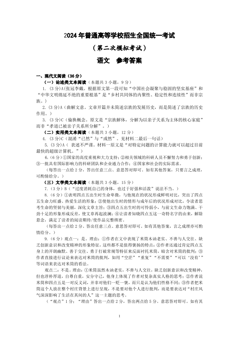 2024届内蒙古自治区包头市高三下学期二模语文答案