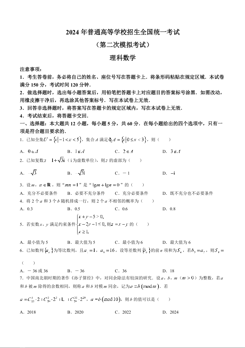 2024届内蒙古自治区包头市高三下学期二模(包头二模)理科数学+答案