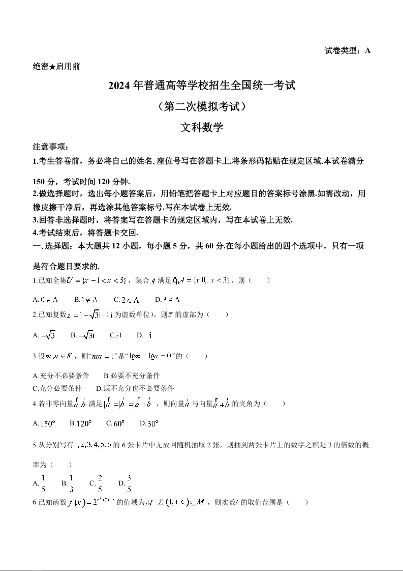 2024届内蒙古自治区包头市高三下学期二模(包头二模)文科数学+答案