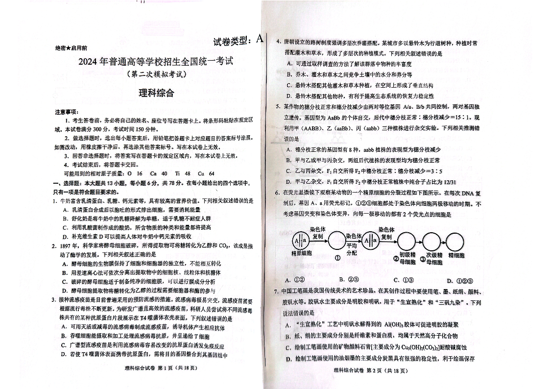 2024届内蒙古自治区包头市高三下学期二模理科综合