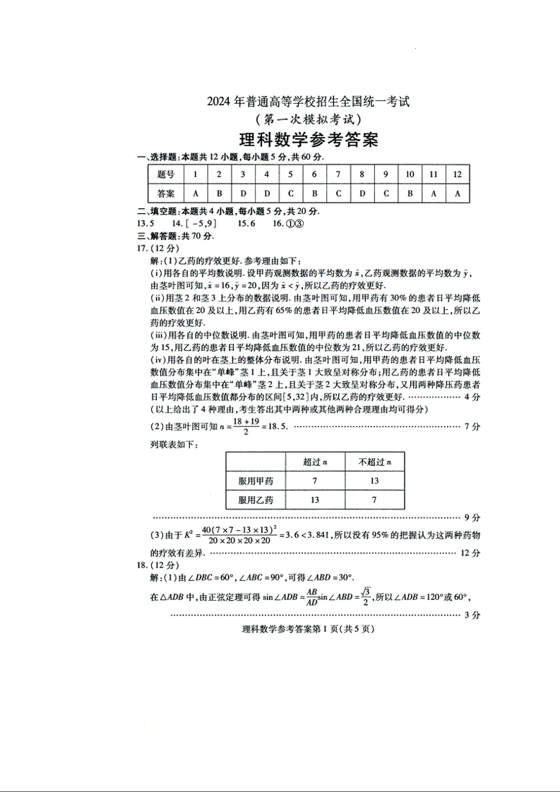 2024届内蒙古自治区包头市高三下学期一模数学(理)答案