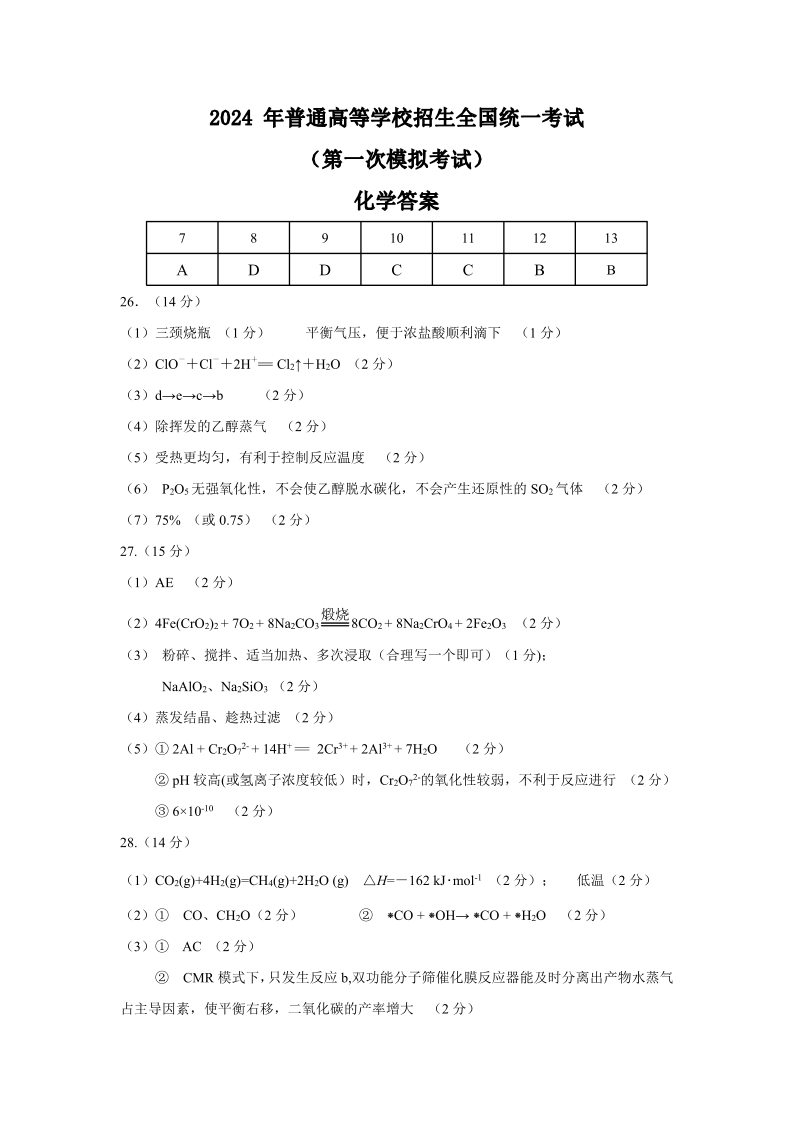 2024届内蒙古自治区包头市高三下学期一模化学答案