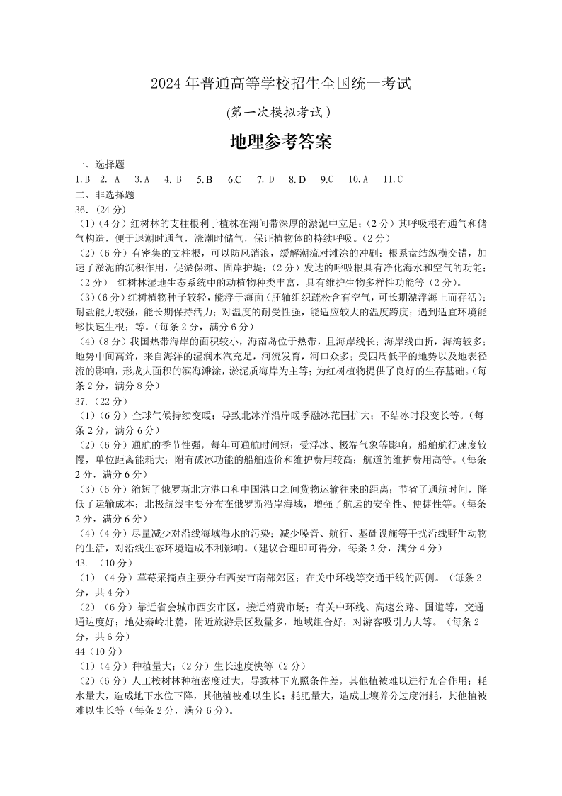 2024届内蒙古自治区包头市高三下学期一模地理答案