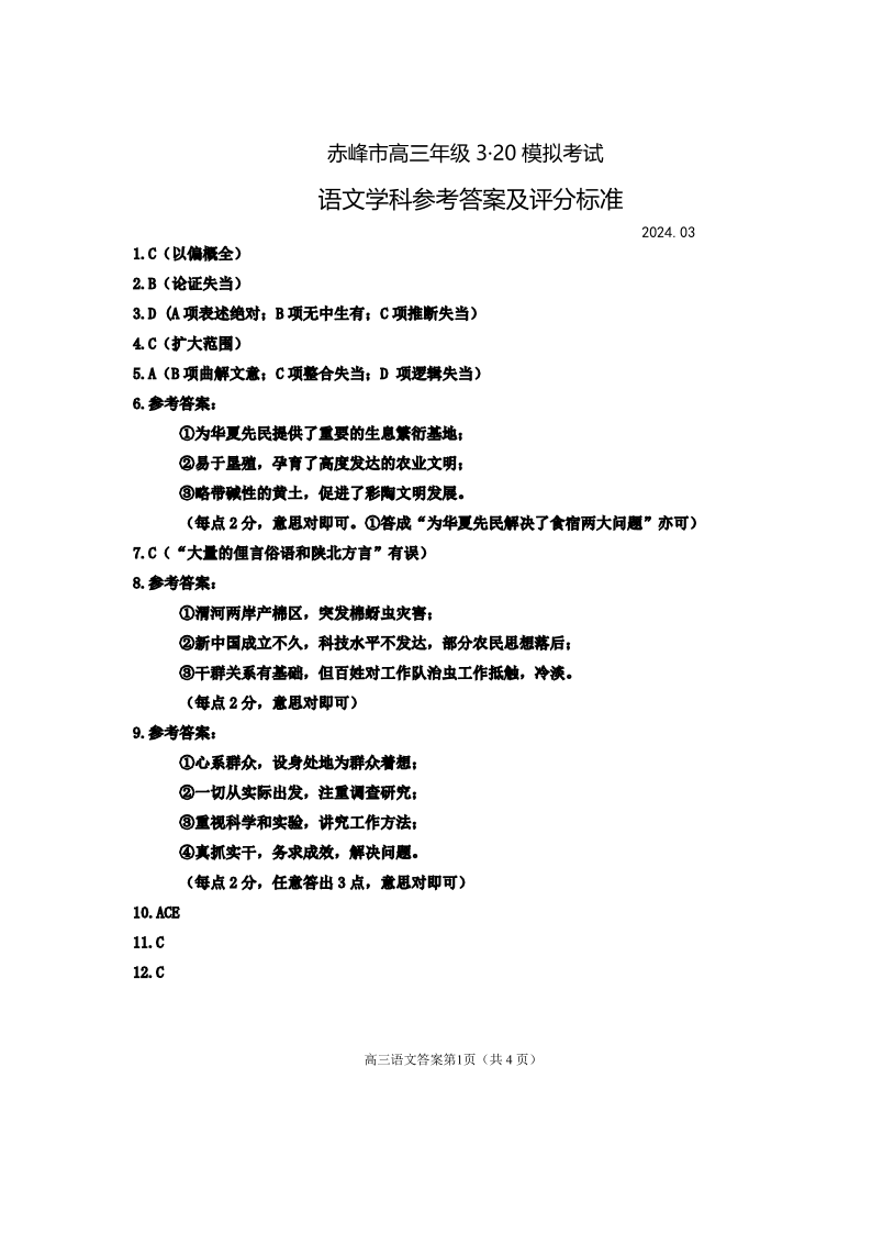 内蒙古赤峰市2024届高三下学期3·20模拟考试语文答案