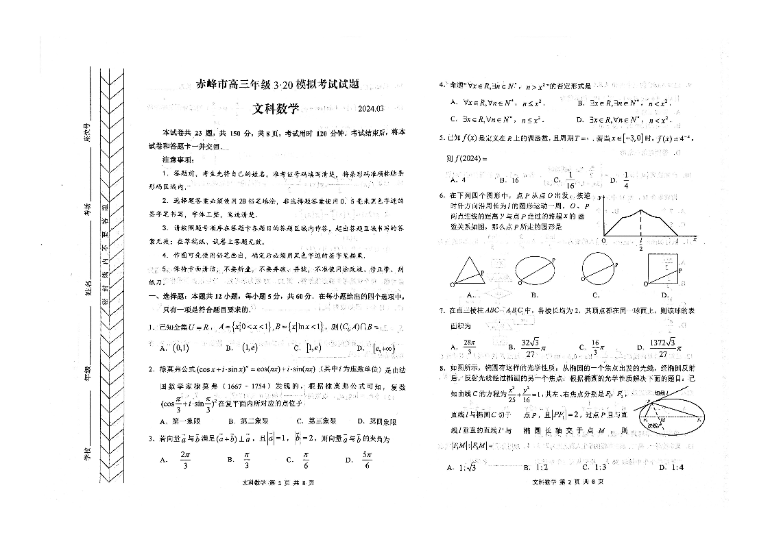 内蒙古赤峰市2024届高三下学期3·20模拟考试文科数学