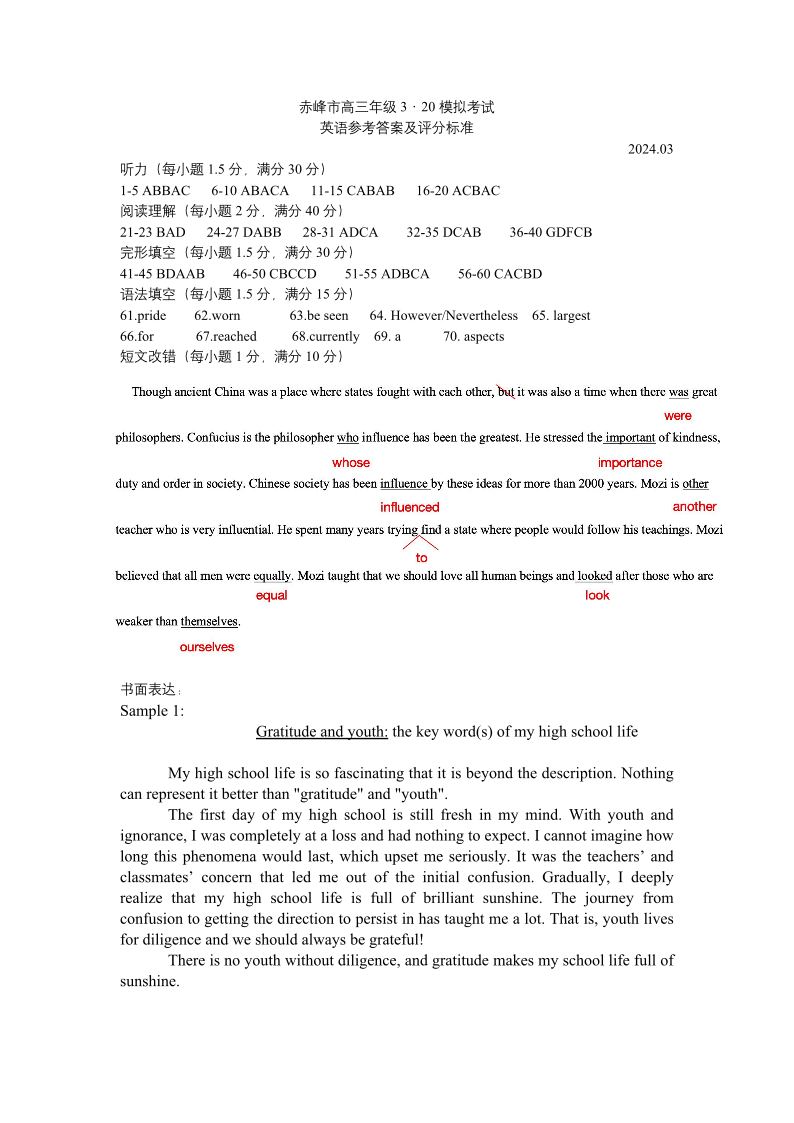 内蒙古赤峰市2024届高三下学期3·20模拟考试英语答案