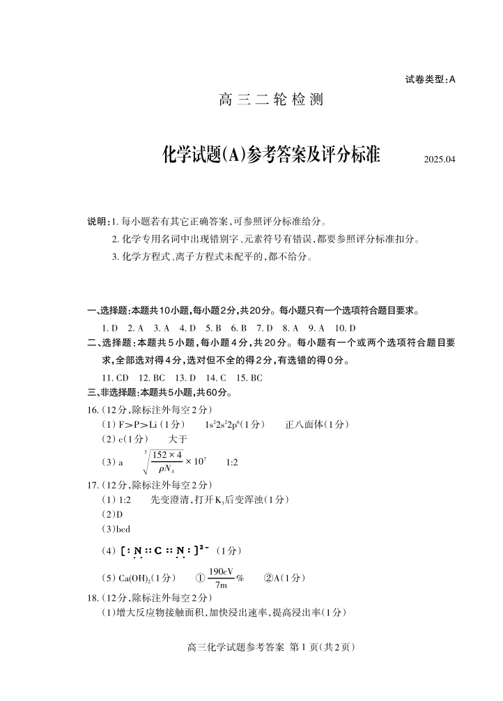 山东省泰安市2024-2025学年下学期高三二轮模拟检测考试化学答案