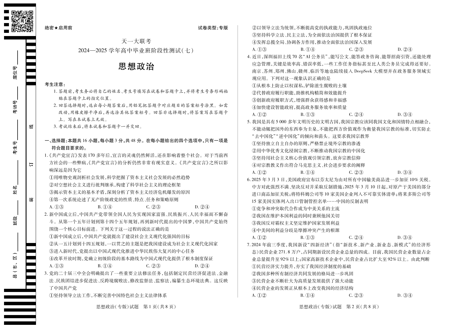 陕西、山西区域高中2024-2025学年高中毕业班阶段性测试(七)政治