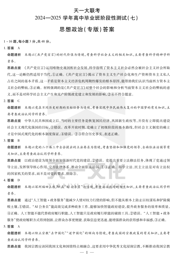 陕西、山西区域高中2024-2025学年高中毕业班阶段性测试(七)政治答案