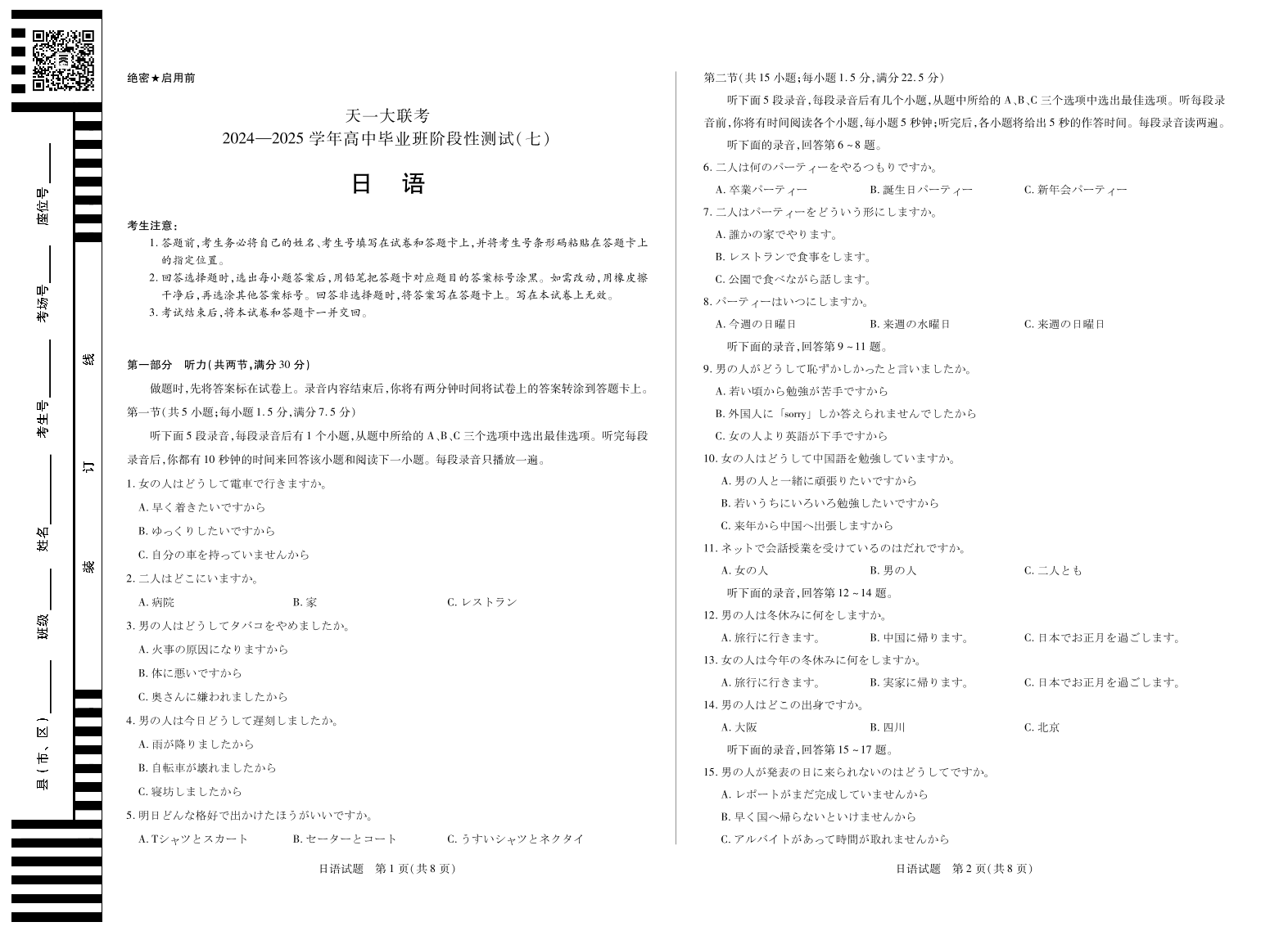陕西、山西区域高中2024-2025学年高中毕业班阶段性测试(七)日语