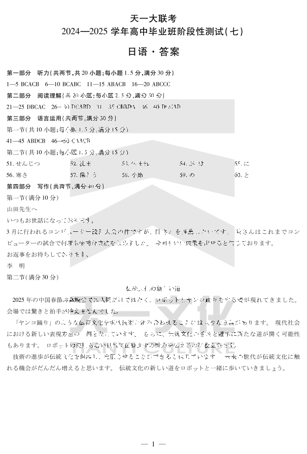 陕西、山西区域高中2024-2025学年高中毕业班阶段性测试(七)日语答案