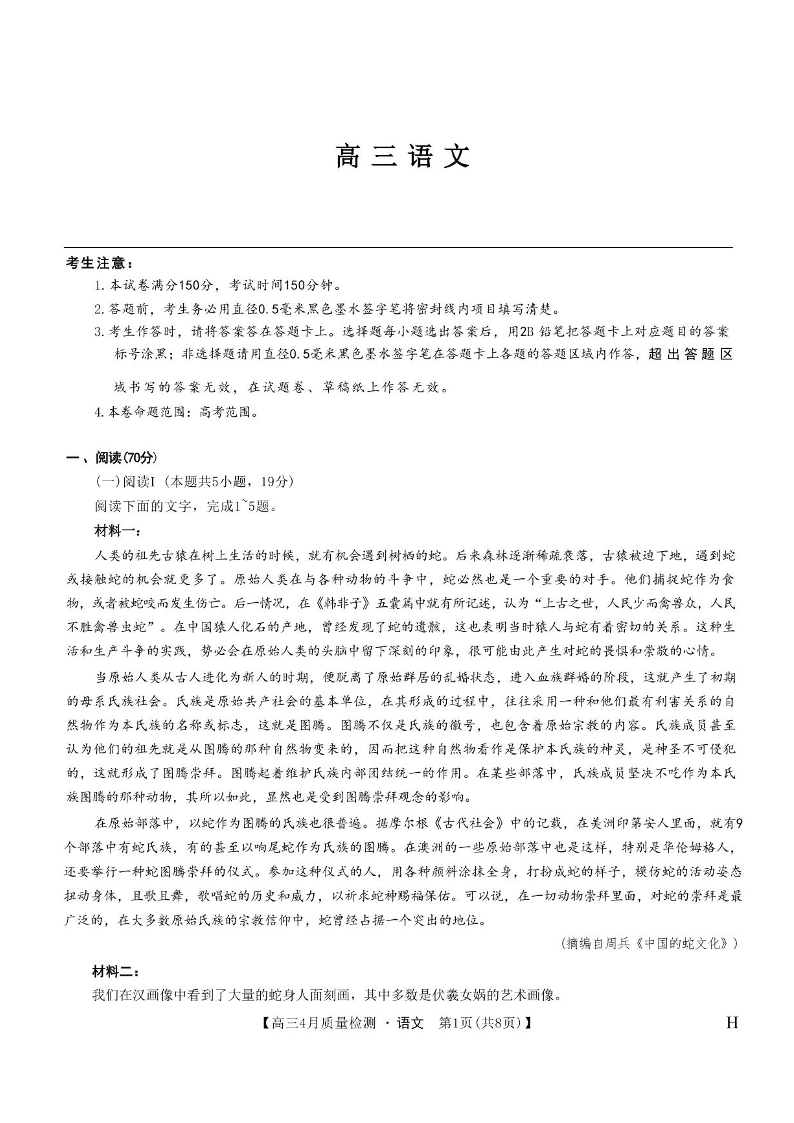 河南省区域高中2024-2025学年下学期4月高三质量检测语文+答案