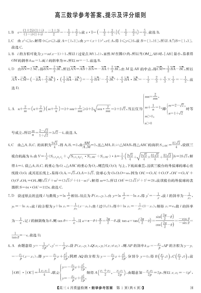 河南省区域高中2024-2025学年下学期4月高三质量检测数学答案