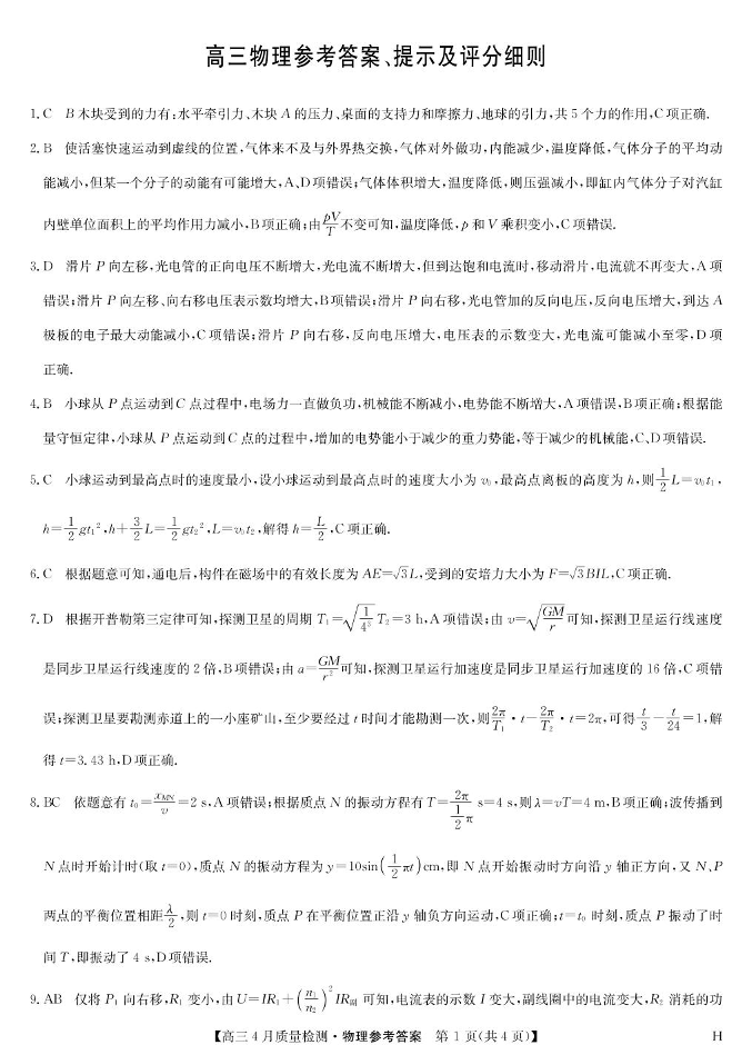 河南省区域高中2024-2025学年下学期4月高三质量检测物理答案