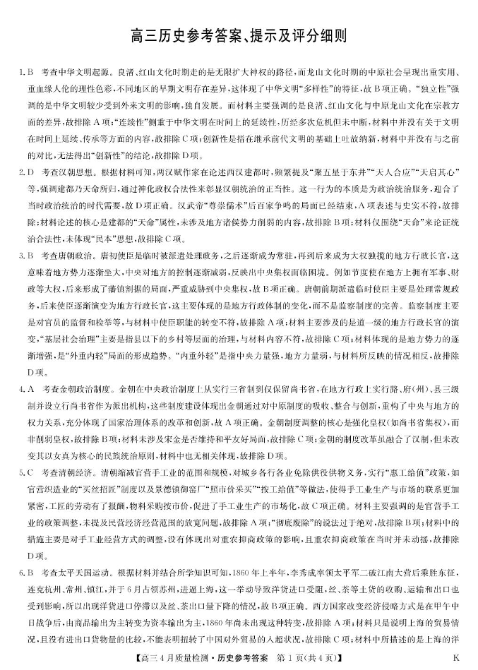 河南省区域高中2024-2025学年下学期4月高三质量检测历史答案