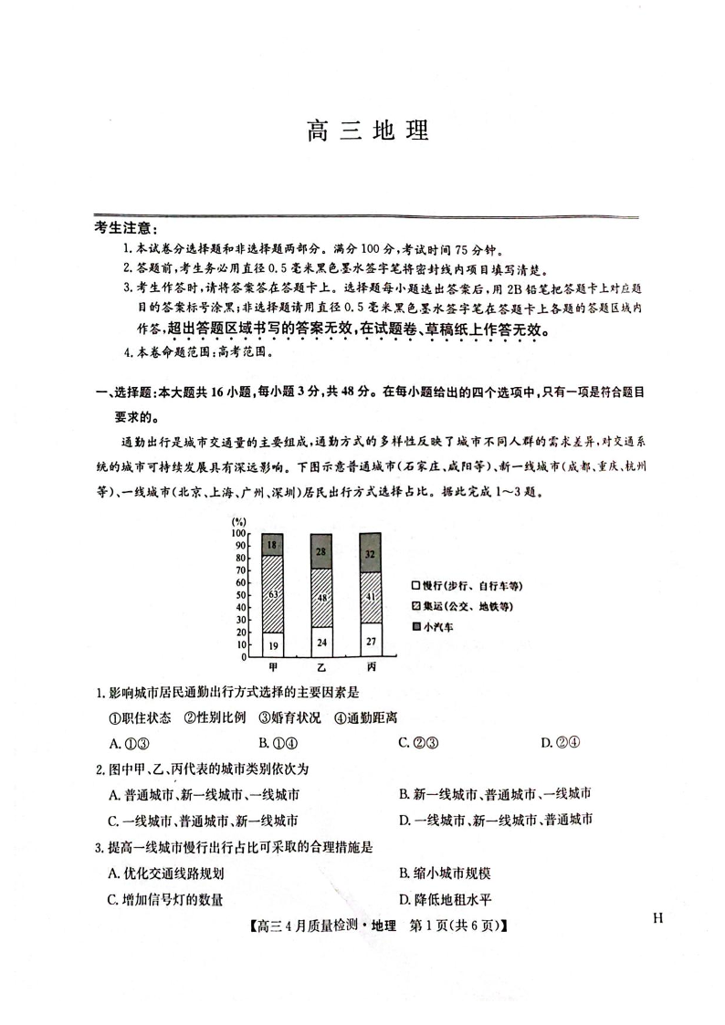 河南省区域高中2024-2025学年下学期4月高三质量检测地理+答案