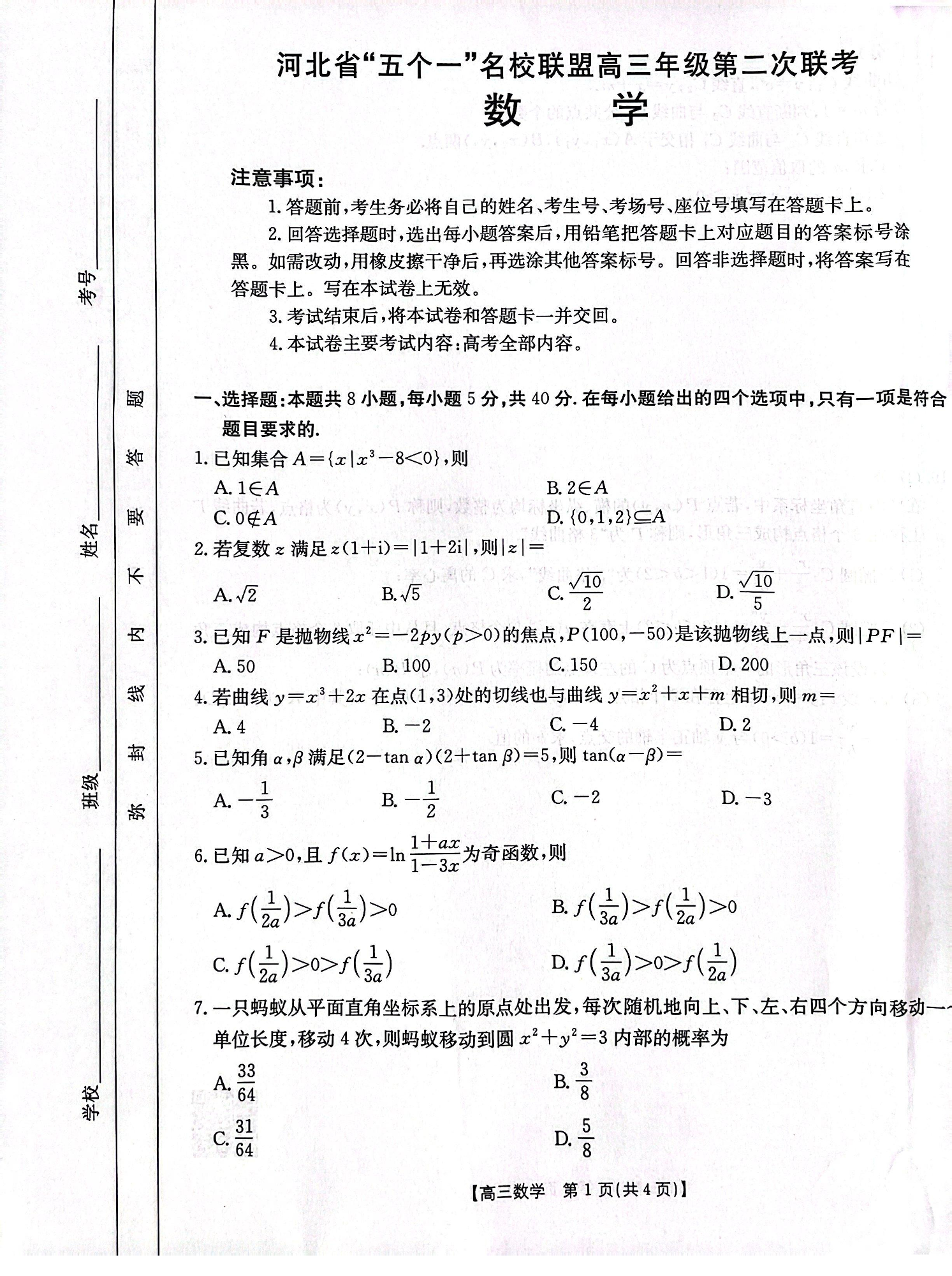 河北省“五个一”名校联盟2024-2025学年下学期4月高三第二次联考数学
