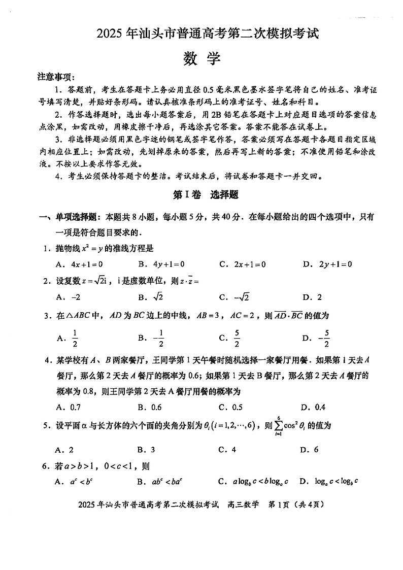 广东省汕头二模2024-2025学年下学期高三第二次模拟考试数学