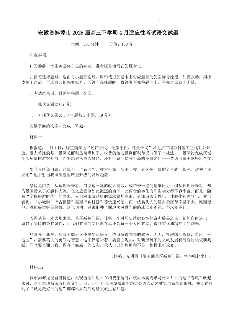 安徽省蚌埠市2024-2025学年下学期4月高三二模适应性考试语文+答案