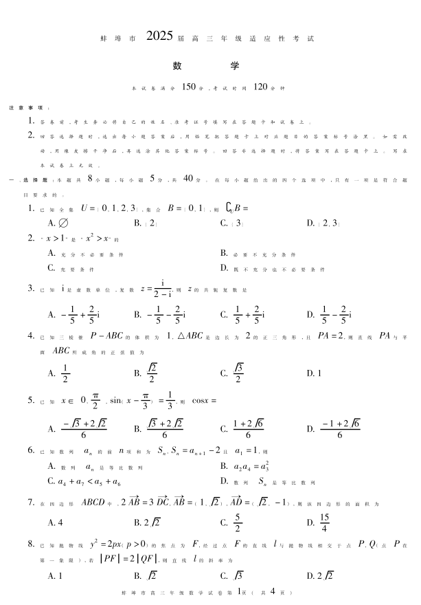安徽省蚌埠市2024-2025学年下学期4月高三二模适应性考试数学