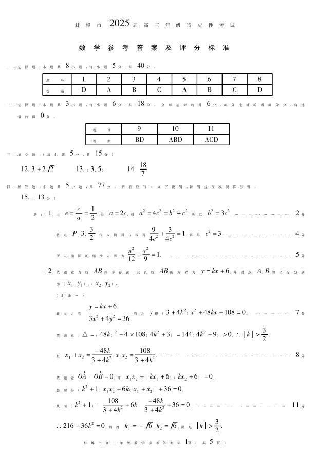 安徽省蚌埠市2024-2025学年下学期4月高三二模适应性考试数学答案