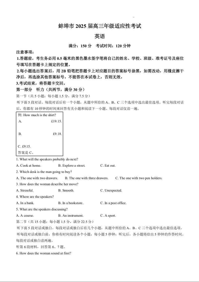安徽省蚌埠市2024-2025学年下学期4月高三二模适应性考试英语+答案