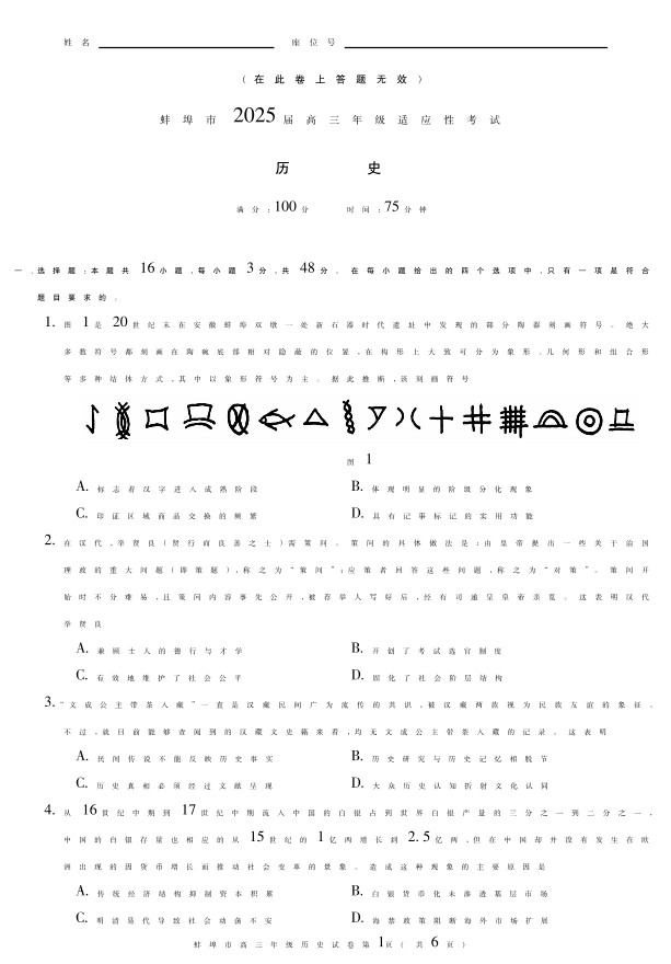 安徽省蚌埠市2024-2025学年下学期4月高三二模适应性考试历史