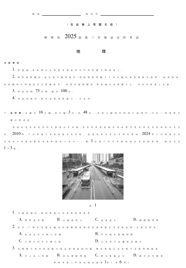 安徽省蚌埠市2024-2025学年下学期4月高三二模适应性考试地理