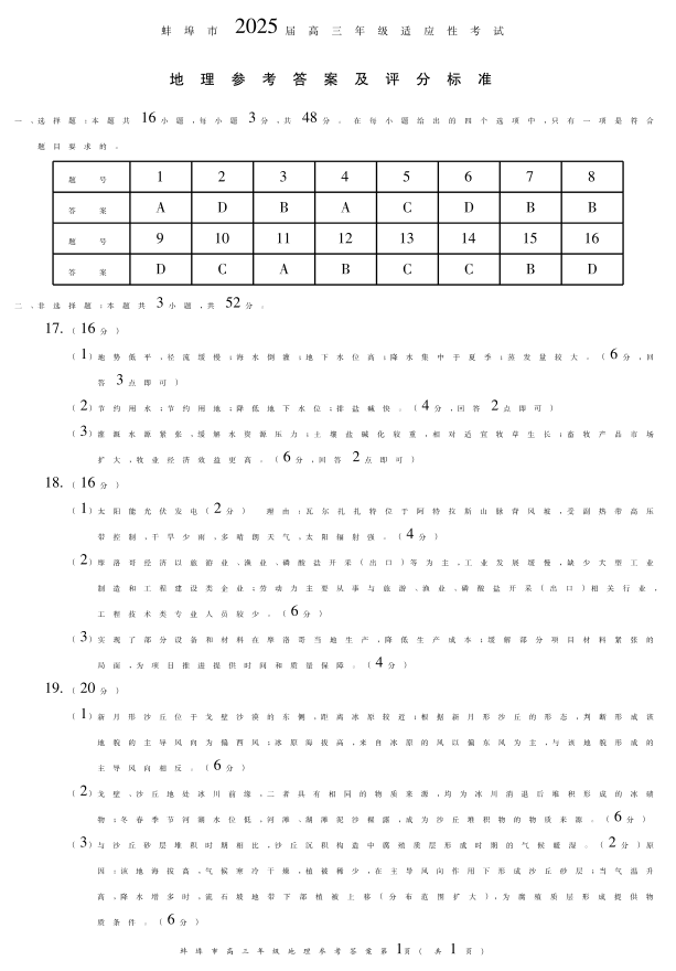 安徽省蚌埠市2024-2025学年下学期4月高三二模适应性考试地理答案