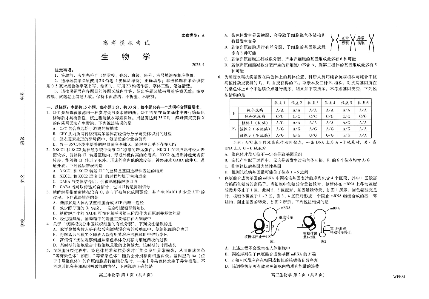 山东省潍坊市2024-2025学年下学期4月高三高考二模统考生物