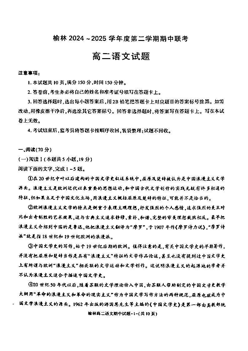 陕西省榆林市2024-2025学年下学期4月高二期中考试语文+答案