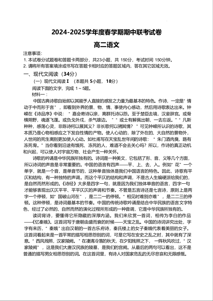 江苏省无锡市六校2024-2025学年下学期4月高二期中联考语文+答案