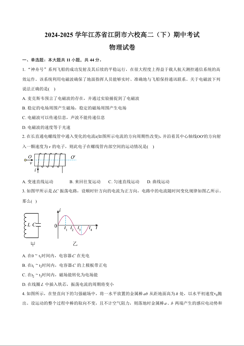 江苏省无锡市六校2024-2025学年下学期4月高二期中联考物理+答案
