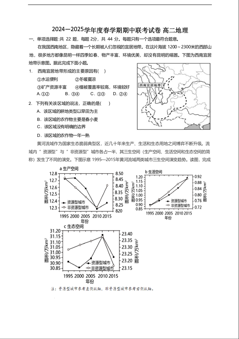 江苏省无锡市六校2024-2025学年下学期4月高二期中联考地理+答案
