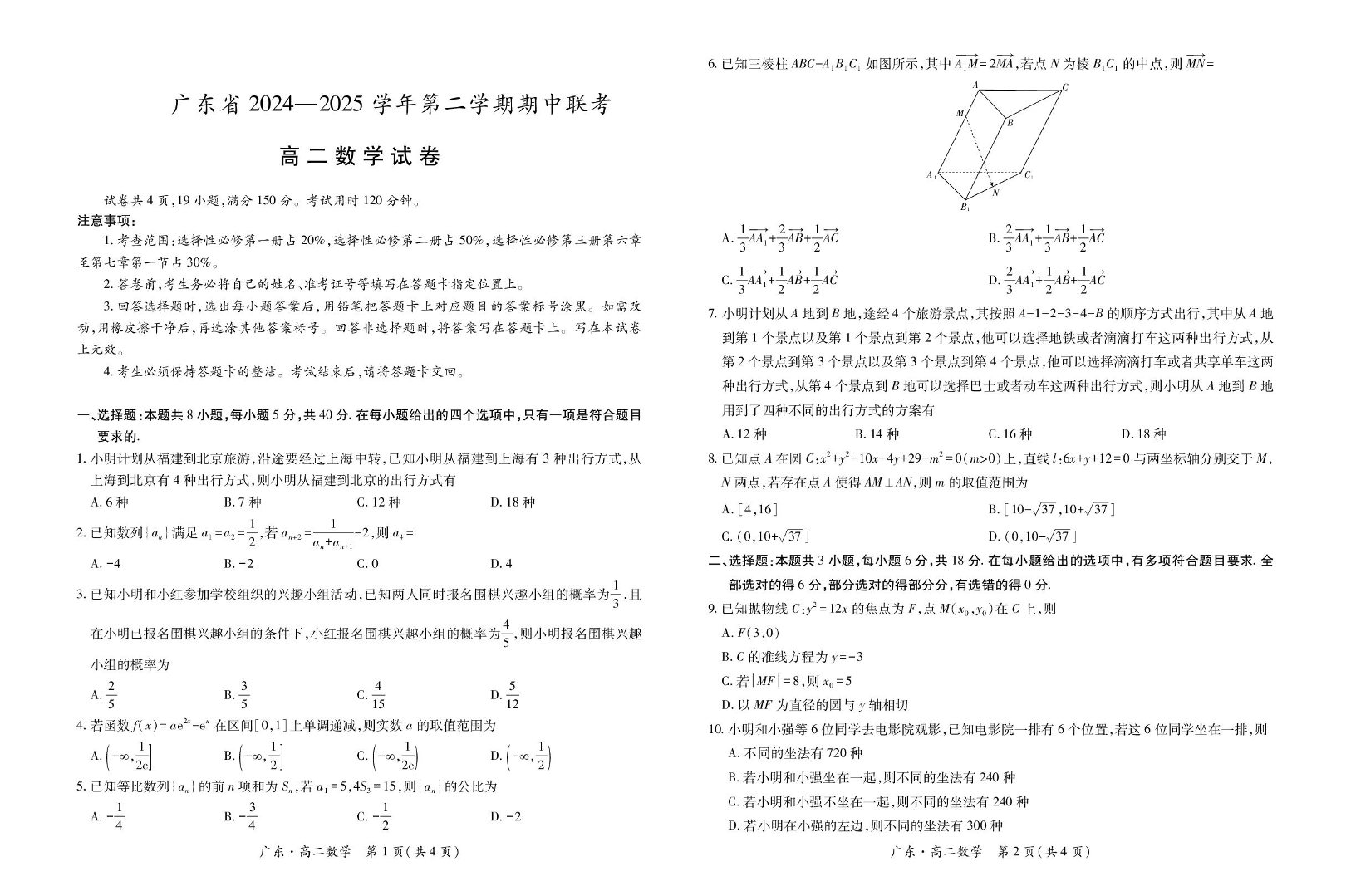 广东省区域高中2024-2025学年下学期高二期中联考数学+答案