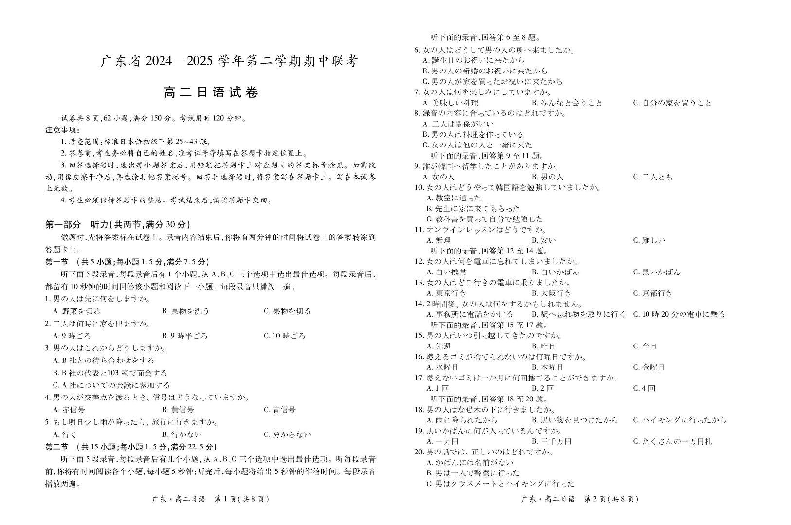广东省区域高中2024-2025学年下学期高二期中联考日语+答案