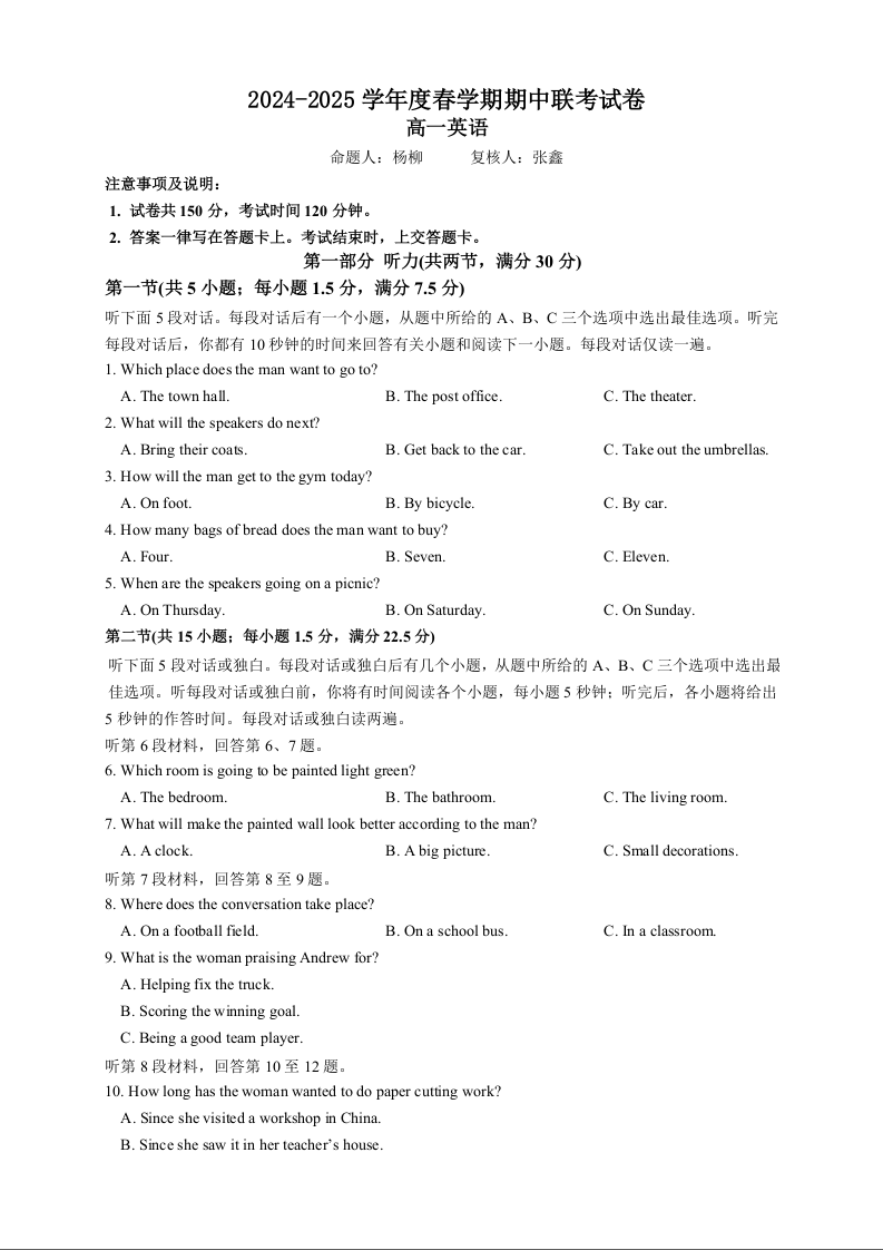 江苏省无锡市六校2024-2025学年下学期4月高一期中联考英语+答案