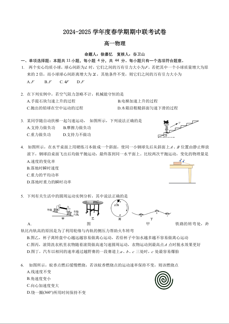 江苏省无锡市六校2024-2025学年下学期4月高一期中联考物理+答案