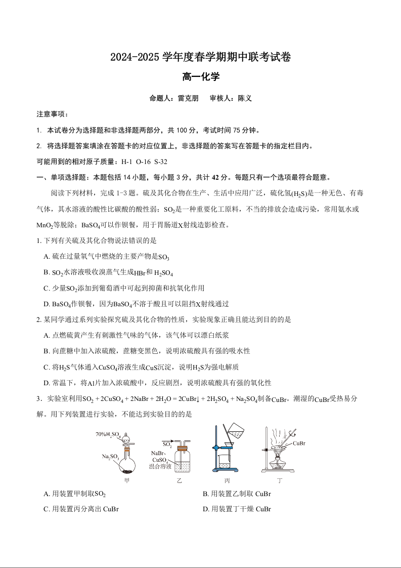 江苏省无锡市六校2024-2025学年下学期4月高一期中联考化学+答案